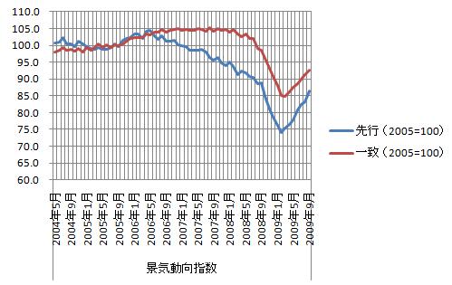 国内景気は、今年2月を底に「回復局面入り」したらしい。しかし、雇用統計からみて現在の景気回復は「雇用なき景気回復」。個人の所得が伸びないことから、早晩、現在の景気回復は終了すると考えられる。既に、10月の景気ウオッチャー調査では、現状判断指数は減少してしまっている。11月で景気回復が終了すると、9ヵ月で景気回復が終わったことになる。景気回復が1年未満で終わる様であれば、日本経済の痛みは相当にひどいことになる。産業構造の調整は避けられそうもない。国内に工場の消失と言うことになるのだろう。9月の景気動向指数、基調判断を上方修正 景気「回復局面入り」確認(2009年11月7日/日本経済新聞 朝刊)10月の街角景気、現状・先行きとも悪化 判断を下方修正(2009年11月10日 日経ネット) 景気動向指数をグラフ化すると下図のようになる。 先行指数・一致指数共に上昇基調で、直近7か月連続上昇。問題は、現在の景気回復が年を越えられるかどうか。個人的にはちょっと無理そうな気がする。 状況は予断を許さない。現在の景気回復は、財政出動の効果、自立回復力に欠ける。この状況で9月に政権交代が発生してしまい、財政出動が途切れることとなった。景気回復が腰折れするのは避けられない。 また、現政権が、前政権との違いを強調し様として、かなり無茶な政権運営を行っている様に見える。現在の景気回復は、政権マターで早晩、「後退局面入り」するだろうと考えている。 もしかしたら、現政権は来年の夏を越えられないかもしれない。 参照資料 景気動向指数(平成21年9月分速報)[内閣府] 経済と株式経済ニュース株取引