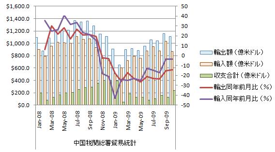 拡大基調であることには違いないが、輸出に比べ輸入の戻りがキツイ。消費者物価・卸売物価の前年同月比がマイナス圏で推移していることから、中国経済には、大きな需給ギャップがあると予想される。当然、需要不足が強い輸出圧力となっているはずなのだが、輸出の戻りは鈍い。逆に、抑制されていいはずの輸入の戻りが速い。鉱工業生産、小売売上統計は強い値を示していて、実質GDPの10%を超えを意識しはじめた。消費者物価・卸売物価の推移と他の統計値は矛盾していて理解できない。統計値が正しいとすれば、中国経済は、構造上の大きな歪みを抱え込んでしまっていると考えられる。WRAPUP3: 10月中国指標は世界の工場復活示す、経済リバランスに向けた変化の兆候も(2009年 11月 11日 16:52 JST ロイター) 中国貿易統計をグラフ化すると下図のようになる。 輸出額は増加基調、直近は減少。対前年同月比はマイナス圏で推移し上昇基調、直近は上昇。直近の輸出増加は、デフレ圧力で先進国が低価格品の需要を増やしている為と考えられる。ただし、米中の貿易紛争が今後、増加すると考えられ、このまま輸出が順調に増加するとは思えない。 輸入額は辛うじて増加基調を維持。直近は減少。横ばいに転じた可能性がある。対前年同月比はマイナス圏で推移するも上昇基調。直近は微上昇。輸入額は、在庫の積上がりから現状以上の上昇は期待薄と見ている。 収支学はプラス圏を低水準で推移。 個人的には、中国はバブル経済に突っ込んでいると考えている。中国企業は、供給過剰で余儀なくされる原価割れ販売の赤字を、資産価格の値上がり益で埋め合わせながら、生産を拡大している状態とみている。ちょうど、日本の80年代後半に発生したバブル初期の状態である。 この段階に突入したなら、政府及び金融当局が如何なる手段をとったとしてもコントロール出来ない。政府介入で資産価格の上昇を止める事ができないと言うことである。銀行融資残高を絞ろうとも資産価格の自己拡大を止めることは不可能。後は行き着くとこまで行くしかない。個人的には、乗って見たい気もするが逃げ遅れて大損してしまいそう、ちょっと考えどころである。参照資料 中国貿易統計[中国税関総署] 経済と株式経済ニュース株取引