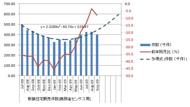 まさかの減少。回復局面なのかどうか怪しくなってきた。初回住宅購入者向け税額控除措置(控除額8000ドル)の延長を決めるのが遅すぎなのだ。許認可件数も前月比4%減と大幅減、ちょっと尾を引きそう。 10月米住宅着工件数は予想外の大幅減、4月以来の低水準(2009年 11月 19日 04:49 JST ロイター) 住宅着工件数をグラフ化すると下図のようになる。 住宅着工件数は減少基調で、直近は減少。対前年同月比も回復基調で、直近も上昇。初回住宅購入者向け税額控除措置が延長されたことからこのまま減少するとは考えられないがちょっと危うさが漂う。地域ではすべて減少。形状では、集合住宅が減少が激しく、一戸建ても減少。 金融機関の貸出姿勢は相変わらず厳しく、個人所得の伸びは、限定的。初回住宅購入者向け税額控除措置がなければ底割れ確実。市場の地合いは相当に悪い。参照資料 住宅着工件数プレスリリース[米商務省] 経済と株式経済ニュース株取引