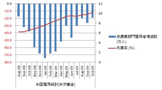 非農業部門雇用者の減少幅が20万人を切ってきた。これで通常の景気後退の底と同じ位まで改善したことになる。状況は、一進一退ではあるが、改善傾向であるのは間違いない。失業率は増加基調で10.2%。失業率が改善するのは、非農業部門雇用者がまだ減少していることから、まだ先のことになりそうではある。10月の米非農業部門雇用者数は‐19.0万人、失業率10.2%=労働省(2009年 11月 6日 22:38 JST ロイター)失業率と非農業部門雇用者数増減数をグラフ化すると下図のようになる。 非農業部門雇用者数増減数は改善基調、直近は改善。失業率は上昇基調で直近も上昇。非農業部門雇用者数増減数は15-25万減あたりで一進一退。労働市場は年内に底入れとは行きそうにない。 米失業保険申請件数の推移から離職者数は徐々に縮小に向かっているが新規雇用が生まれていない。時間外労働と賃金の伸びはいいのだが・・・なかなか、雇用環境の改善が進まない。年末商戦を直撃しそうである。参照資料 CPSプレスニュース[米労働省]経済と株式経済ニュース株取引