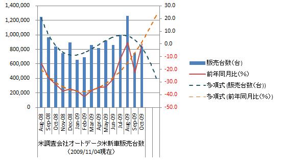 買い替え支援プログラム切れをこなし米新車販売は対前年同月比は横ばい。昨年の落ち込みを考えるともう少し戻っても良さそうな感じである。10月は新車投入効果で乗り切った感じである。メーカにより対前年同月比で大きな差が発生しているところを見ると、各社正念場に差し掛かったと言うことだろう。個人的には米自動車市場の回復には懐疑的で今後しばらくは横ばいすると考えている。<米新車販売>10月、前年比ほぼ横ばい 前月比は12%増(11月4日(水)10時36分配信 毎日新聞) 米新車販売台数の推移をグラフ化すると下図のようになる。 10月の戻り具合から販売台数は横ばいに転じたとみられる。対前年同月比は上昇基調だが、だんだん穏やかになって来そうな雰囲気。現在の雇用状況や所得の伸びをみるとデフォルト率は高水準に張り付くと考えられ。ローン・リース販売に頼ったメーカは年末に向かい大きな特別損失を抱えることになるかもしれない。 今年の販売実績を単純平均すると86.5万台。単純に年換算すると1039.3万台。1-10月までの販売累計は865.3万台。対前年同期比25.4%減。対前年同期比から年換算すると987.8万台。年末までに前年同月比が横ばいするとして換算するなら、年間販売台数は1030万台程度、個人的には、960~1000万台とみている。 詳細は、やはりGM・クライスラーが厳い。特にクライスラーは最低。来年にもフィアットが引きそうな状況。GMは、先月の落ち込み、新車投入を考え合わせるとGMもかなり厳しい。トヨタ・ホンダは嫌な雰囲気。フォード・日産は上々。韓国現代は絶好調。個人的には先月の下落幅を戻しただけで回復力は弱そう、底割れは起きそうにないがあまり期待できる状況ではない。経済と株式経済ニュース株取引