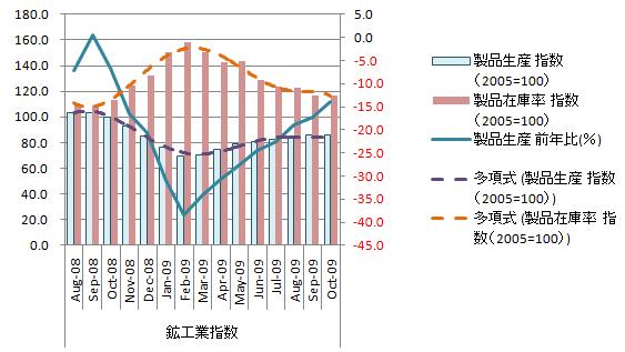 生産拡大幅の縮小傾向が鮮明化してきた。来年1-3月には余程のことがないとマイナスに転換すると見られる。先月よりも状況は悪化し、円高から新興国向け輸出頼みの生産拡大はちょっと厳しそうな状況である。現政権下の産業政策・経済政策はちょっと期待できないからちょっと困ったことになってきた。 鉱工業生産0.5%上昇 10月、伸び率は大幅縮小(2009年 11月 30日 11:24 日経ネット) 鉱工業生産・在庫指数をグラフ化すると下図のようになる。 生産指数は辛うじて上昇基調を維持、直近8ヵ月連続上昇。対前年同月比も同様。在庫率指数は下降基調なれど改善幅が減少しほぼ横ばい。在庫率指数は適正水準と考えられる100を大幅に上回る116.9で改善が足踏みし始めたと言うことはになる。生産の戻りが出荷の回復幅を上回り在庫調整が進まないと見られる。 前月比の推移をグラフ化すると下図の様になる。 生産指数の前月比は、徐々に増加幅が減少。11月-12月はプラス圏を維持できそうではあるが先行きはちょっと暗い。出荷も同様で生産よりも先行きが悪い。在庫指数の改善もひと段落。生産指数の谷から山までの平均はだいたい一年前後、通常なら来年1-3月位で下降に転じるはず、グラフを見る限りでは、今回は早めの転換なりそうである。 対前年同月比の推移をグラフ化すると下図の様になる。 生産・出荷指数の対前年同月比はマイナス幅を徐々に縮小しているが対前月比の推移からみてマイナス10%前後で縮小が止まるのではないかと予想される。 現状、企業在庫は過剰で、出荷指数推移からみて後5か月で調整できる範囲にはないと思われる。経営陣としては、今年度末なら損を出しても株主に言い訳がつくが来年度は無理と見ていると考えている。現在の過剰在庫分は、来年度に繰越せない。企業は年度末に向け生産を縮小してくることが予想され、今後、業績の上方修正は限られてくると考えている。参照資料 鉱工業指数[経済産業省] ブックマーク 経済と株式経済ニュース株取引