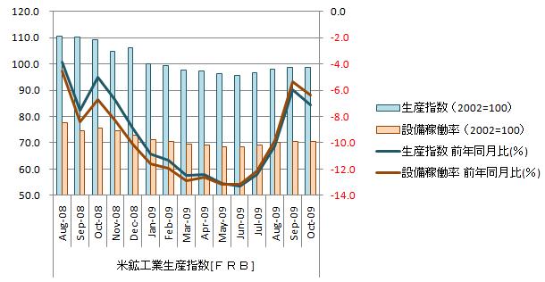予想に反し国内生産が伸び悩み始めた。自動車・同部品生産が停滞した影響が大きい。10月の小売売上高は自動車・同部品の好調が全体を押し上げたのに・・・やっぱ需要の先食いの影響かぁ~。 内需の回復が弱く、ドル安で後押しされている外需の伸びでも補い切れず、鉱工業生産が抑制されたようだ。9月貿易統計の輸出の伸びは結構いい数字なのに・・・かなり深刻。 設備稼働率から見て、米国でも需給ギャップが大きく、政府の景気対策だけではギャップを埋めることができていない。米国の場合は、需給ギャップと言うより、需給のアンマッチと表現した方が正しいのかもしれない。 需要はあるのに、応える産業が国内に存在せず、輸入が増えるだけで国内生産が伸びない。輸入抑制、輸出促進のドル安政策も、資源価格上昇で、これ以上は無理とFRBは判断しているようだ。はてさて、米国政府はどうする気だろう。10月の米鉱工業生産指数は+0.1%、設備稼働率は70.7%=FRB(2009年 11月 17日 23:23 JST ロイター) 米鉱工業指数、稼動率指数をグラフ化すると下図のようになる。 鉱工業生産指数は上昇基調、直近は横ばい。対前年同月比はマイナス圏で推移し上昇基調、直近は下降。対前年同月比は下降若しくは横ばいに転じたかもしれない。 設備稼働率は横ばい、直近は微増。上昇はしているが非常に緩慢。対前年同月比は、マイナス圏で推移し上昇基調、直近は下降。在庫の積増しは、ほぼ終了し、これ以上の改善は厳しそう。 鉱工業生産指数は98.6、設備稼働率は70.7%、どちらも、あまりに低い水準で横ばいを始めたことから、需給ギャップは思っていたより深刻そうである。今後の需要回復で解消するのは無理、供給力の縮小は避けられそうもない。米国でも日本と同様に需要の中心は低価格商品に移ってしまい、しばらくは元に戻らない。国内で高価格帯商品しか生産してない米国は、今後、生産設備の統廃合が始まると思われる。個人的には米国の製造業は一段と縮小すると思われる。参照資料 米鉱工業生産指数[FRB] 経済と株式経済ニュース株取引