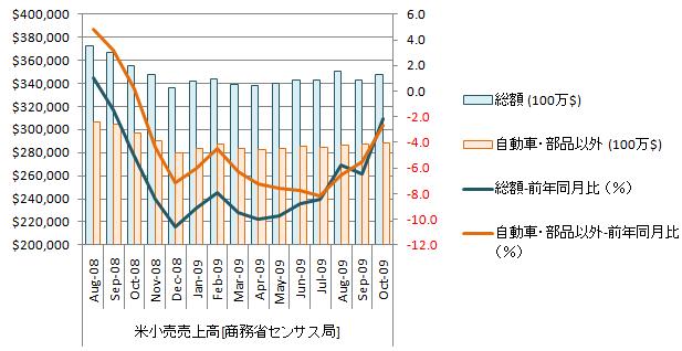 米国の消費は底堅い。自動車買い替え支援で需要をかなり先食いしたはずなのに先月の落ち込みだけで済んだようである。消費の底割れはなさそうなのだが、順調な回復とは言い難い。一進一退で徐々に増加していくと考えられが、今年のクリスマス商戦には間に合わない。昨年ほど酷いことにはならないだろうが、好調には程遠い展開となりそうである。9月の貿易統計は、中国から貿易赤字を増やし、輸入が急増。クリスマス商戦は、値引き販売合戦となりそうだ。 10月米小売売上高は予想上回る増加、自動車販売が押し上げ(2009年 11月 17日 02:24 JST ロイター) 米小売売上高をグラフ化すると下図のようになる。 総額は増加基調で推移し、直近も増加。前月の急落分を埋めるも前々月の水準までは戻らず。対前年同月比はマイナス圏で推移するも上昇基調。直近も上昇。プラス転換はもう間近。 自動車・同部品を除いた額も増加基調で推移し、直近3ヵ月連続増加。対前年同月比はマイナス圏で推移し上昇基調。直近3ヵ月連続で上昇。 今回の景気回復は『雇用なき景気』、消費の戻りは非常に緩慢になると予想される。しかし、米国の総人口は増加基調、労働力人口が移民で大量に流入している為、人口ボーナスが大きく、いずれは拡大していくことが確実である。来年4-7月あたりで本格的な回復に向かいそうだと考えている。参照資料 米小売売上高統計[商務省] 経済と株式経済ニュース株取引