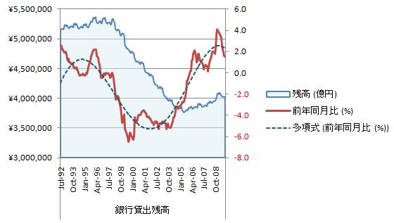 銀行貸出残高は、前年同月比1.5%増の402兆5840億円。銀行貸出残高は減少基調に転じたと考える。大手都市銀行の四半期決算からは最悪期を抜けた様だが、BIS規制・返済猶予法案対応の為、貸出残高を積極的に増加させる雰囲気ではない。銀行は国債などの公債運用の比重を更に高めてくると思われる。政府による民間資金の吸上げ激しく、中小企業にお金が回らない構造が長期に亘り続くことになりそうである。 10月の銀行貸出残高、前年同月比1.5%増(11月10日/日本経済新聞 夕刊)銀行貸出残高をグラフ化すると下図のようになる。 銀行貸出残高は、減少基調で直近は上昇。機械受注統計は、設備投資も来年4-6月頃には底入れしそうだが。資金需要は、ちょっと戻りそうにない。銀行としては、資金を公債運用するしか利益確保の手がなさそうに思える。リスクを取って金を貸し出せる状態にはなさそうである。 国内金融機関は預かり資産で国債を購入。政府は国債を売って調達した資金を国民に手当・給付金・還付金として現金で配る。国民は、配られた現金を国内金融機関に貯金する。国内金融機関は預貯金された資金で国債を購入し、政府へ資金を貸出す。資金は、なにも産出せず金融機関→政府→国民→金融機関へ移動し、負債だけが増加することになる。現政権の経済政策を考えると、このサイクルにまわる資金量が加速的に増える可能性ある。当該サイクルの資金は労働力との交換がない為、付加価値を産み出さず、GDPに何の貢献もしない。政府が調達した資金で財・サービスを購入するのであれば、財・サービスは労働成果物、労働力と資金が交換されたことになる。財・サービスは生産される過程で労働力が消費され付加価値が産出される為、GDPを押し上げる。 日本の場合、超巨大金融機関、日本郵便が大半の資金を国債に充てている為、政府が直接現金を国民に配ると、先にあげだ金融機関→政府→国民→金融機関のサイクルに資金が滞留し易い。更に都合の悪いことには、日本は貯蓄率が高い。「踏んだり蹴ったり」である。 現政権は、日本郵便を官営に戻した為、日本郵便の資金を公的部門以外には振り向けることは無理がある。銀行は、民間資金需要の低迷で預金の運用先を国債に振り向けざるを得ない。政府は、国債で手当した資金を、直接給付に使う方針の様に見える。日本全体の資本効率は加速的に悪くなるのではと考えてしまう。『金融機関→政府→国民→金融機関』サイクルに滞留する資金量が増えると強いインフレ圧力が生じると見るが、どこで限界に達するのか・・・でも、現政権は引き金を引いてしましそうで怖い。参照資料 貸出・資金吸収動向等[日本銀行] 経済と株式経済ニュース株取引