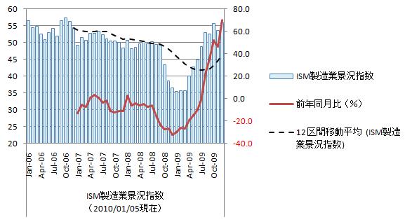 いまさらの米ISM非製造業指数。非製造業総合指数(NMI)は50.1で前月からは改善。景気判断の分かれ目となる50を上回るも、良いとも悪いとも言えない結果である。ISM指数からは製造業は好調、非製造業は低調。やはり、消費の回復が遅れている。 米企業の景況感回復 ISM非製造業指数、2カ月ぶり50超(?2010年1月6日 日本経済新聞) 米ISM製造業景気指数をグラフ化すると下図のようになる。 製造業景気指数は好不況の分かれ目となる50を回復するも、下降局面。直近は上昇。米ISM景気指数の詳細からは「新規受注」「新規輸入受注」は悪化、「在庫」「輸入」が改善。「新規受注」「新規輸出受注」が減少していることから局面転換はちょっと無理。1-3月辺りまでは緩やかに下降すると見ている。50割れになりそうである。 11月の貿易統計からは消費が戻ったのかと思っていたが期待通りとはいかない。やはり雇用と個人の債務過剰が相当に効いている。景気回復基調は間違いないがその足取りは相当に遅くなしそうである。参照資料 ISM非製造景況感指数ニュースリリース米国経済(景況感) ブックマーク 経済と株式経済ニュース株取引