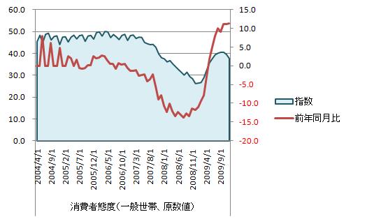 う~~ん。消費者マインドは下降気味、景気拡大は2月で一旦横ばいか下降に転じそうな雰囲気である。小沢氏の土地取引問題で国会も荒れそうだしちょっと先行き不透明感が増している。個人的には小心者なので、リスクをとって投資する程の度胸がない。臆病者!! 12月消費者態度指数は悪化、基調判断を下方修正=消費動向調査(2010年 01月 19日 14:06 JST ロイタ) 景気動向指数をグラフ化すると下図のようになる。 消費者態度指数は下降基調、直近3ヵ月連続下降。対前年同月比はプラス圏で推移し横ばい、直近は増加。4項目中、「雇用環境」「暮らし向き」「収入の増え方」の3項目が減少、特に「雇用環境」の減少がきつい。 景気動向DI先行指数の推移をグラフ化すると下図のようになる。 景気動向DI先行指数の推移と合わせて考えると間もなく景気の縮小が始まると思われる。なんとか2月は持ちこたえそうだがそれ以降はちょっと先行きが見えない。景気の現状は相当に悪く、これで横ばいでなく縮小へと転じることになると相当厄介なことになる。個人的には景気が縮小に転じる可能性が大きいと考えている。本日、一旦、手じまい、来月は様子見をしてみよう個人的にはと考えている。参照資料 消費動向調査(全国月次、平成16年4月調査より) 結果[内閣府]国内経済(景況感) ブックマーク 経済と株式経済ニュース株取引