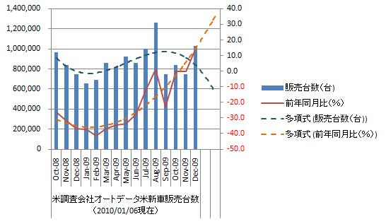 極めて良好。当面横ばいと見ていたが上抜けしてきた。米国ビック3の苦境は継続で、日本のビック3は堅調。米国勢はGM・クライスラが厳しく、フォードが好調。日本勢はトヨタが良好で日産が出遅れ。韓国メーカは相変わらずの絶好調を継続。 12月の米自動車販売は好調、フォードやトヨタ<7203.T>が主導(2010年 01月 6日 07:28 JST ロイター) 米新車販売台数の推移をグラフ化すると下図のようになる。 販売台数は8月に次ぐ103万台で、上昇基調、直近上昇。対前年同月比は上昇基調、直近上昇。自動車販売は今後も緩やかな拡大が予想される。雇用環境の回復の遅れや個人信用力の低下から販売台数の急増は期待できないが、人口増と買替え需要で底堅い販売が予想される。 ただ、消費者の性能より価格を重視傾向が継続。昨年程ではないが値引き販売は相変わらず横行しているようである。需要動向は、大型車に偏る米国車メーカに不利。高級車種を主軸に置く日本車メーカも厳しい。廉価車種を多く揃える韓国車メーカに有利。モーゲージローンは、『GMACフィナンシャル・サービシズに38億ドルの追加資本を注入し、政府の持ち株比率を従来の35%から56%』など環境の悪さは相変わらず、韓国車メーカはかなりのリスクを取っている様である。リスクが実現化しないことを祈るのみ。 今年の販売実績を単純平均すると88.8万台。年間販売台数は1,042.9万台。対前年同期比15.5%減。年間販売台数は1000万台と考えていたので、個人的には上出来な数字。中国に市場規模で抜かれたとしても1000万台市場、存在感は相変わらず大きい。 来年の米国自動車販売台数は1100万-1200万台、自動車保有台数も減少と考えている。原油需要の伸びは限定的と考える。参照資料 米国産業(自動車) ブックマーク 経済と株式経済ニュース株取引