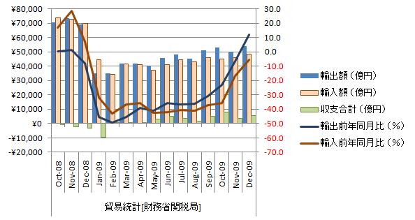 財務省のホームページからアジアと中国分のデータがダウンロード出来ない。先月までは何の問題もなかったのにィー。他データは問題なくダウンロードできるから、当該ホームページよりダウンロード使用としている人が大勢いてサーバが対応できないってこと?。仕方ないので取得できるデータのみで適当に書いてみる。 輸出額は対前年同月比12.1%増の5兆4128億円。対前年同月比がやっとプラスに転じた。戻りが悪く依然低水準だが穏やかに拡大を続けている。但し、中国政府が金融引き締めに舵を切ったようなので輸出に黄色信号が点った気がする。 輸入額は対前年同月比5.5%減の4兆8675億。輸出と比して、若干戻りすぎ。12月は円安と寒波の影響で原油輸入額が増加した影響と見られる。 12月の輸出、15カ月ぶり増加 EU・中南米向けも拡大(2010年01月27日/日本経済新聞 夕刊) 貿易統計をグラフ化すると下図のようになる。 輸出は増加基調、直近は増加。輸出の対前年同月比はプラス圏に突入し上昇基調。直近5ヵ月は上昇。対前月比は順調に上昇。 輸入は増加基調、直近2ヵ月は増加。輸入の対前年同月比はマイナス圏で推移し上昇基調。直近4ヵ月は上昇。輸入の対前年同月比は上昇。来月にはプラス圏に到達すると見られる。 収支は11ヵ月連続の黒字、直近は増加。 輸出は緩慢な上昇基調、水準は最高額と比べると7割程度。現在の増加率が継続するなら、最高額を更新するのは2011年4月。個人的には難しいのではないかと見ている。中国需要はバブル的要素が強く、破産法制が整っていない中国で大きな経済の調整が起きれば混乱必至。部品の調達に問題がでて、日本の国内生産ラインも止めざるをえない。既に国内の多くの技術や生産設備が中国へ移管されており、国内からは消滅している。輸出先を失うよりも輸入先を失う影響の方が大きそうな気がする。 貿易統計の長期推移をグラフ化すると下図のようになる。 輸出と輸入共に回復基調を継続しているが水準は芳しくない。収益も改善してきた。ただ、昨年2月を始点に一時回帰直線を取ると月を追うごとに傾きが鈍化している、そろそろ金融危機による急減のリバウンドも終了しそうである。方向性としては横ばいに転じそうである。 米国・中国・EU向け全ての対前年同月比は上昇。全体的には回復基調を継続。EU、大洋州、中南米が新たにプラス転換。問題は、中国。増え過ぎ、中国経済に国内経済が強依存状態。中国への輸出の伸びはもう限界に近く何時減少に転じるかわからない。米国・EU安定的に推移すると考えるが中国は変動が激しそうな気がする。参照資料 平成21年12月分貿易統計(速報)[財務省]国内経済(貿易) ブックマーク 経済と株式経済ニュース株取引