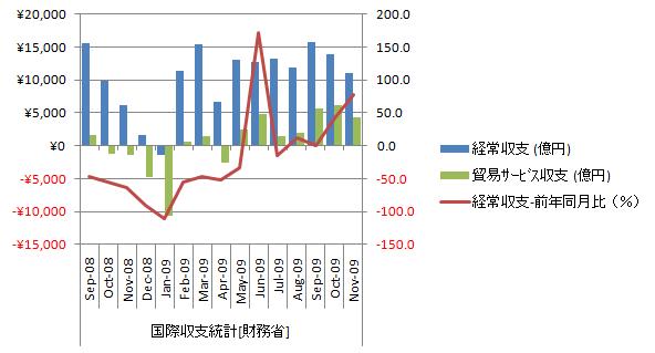 2009年11月の貿易収支は前年同月比76.9%増の大幅改善。前年の下落の影響と見られ、数字ほど実態は改善していない。資本収支は前年同月比13.3減で5ヵ月連続のマイナス。こちらは、円高と海外子会社配当の減少の影響。経常収支は1兆円~1.5兆円、貿易・サービス収支は0.5~0.7兆億円の範囲で、当面、一進一退を繰り返すと考えている。 11月の国際収支、経常黒字76.9%増 アジア向け輸出持ち直す(2010年01月12日 10:39 日経ネット) 経常収支をグラフ化すると下図のようになる。 経常収支は、減少基調。直近2ヵ月減少。減少は季節要因。対前年同月比はプラス圏で推移し上昇基調、直近2ヵ月は上昇。前年の急落の影響。11月の経常収支は1兆1030億円で、年末に1兆15000億円を超えられる水準とは思えない。やはり、経常収支は1兆前半で安定し、推移すると考えられる。 経常収支の水準を見るため長期推移をグラフ化すると下図のようになる。 経常収支の12か月移動平均は2000年前半水準の2/3程度まで落ち込んだ後、緩やかに増加基調に転じた模様。しかし、欧米先進国、特に米国消費の戻りが遅く、拡大はかなり緩慢とならざるを得ないのではないかと考えている。また、中国が金融政策を引き締めに転じつつあると思われ、今後もアジア向け輸出が大幅に伸びるとは考えられない。経常収支が1兆円前半で安定すれば上出来、悪ければまた1兆円を割り込んでくる可能も捨てきれないない。 貿易・サービス収支と所得収支の長期推移をグラフ化すると下図のようになる。 所得収支の対前年同月比の一次回帰直線はy=-1.1889x+ 57.286。海外投資資産からの配当は長期減少傾向にある。10-30年のスパンを考えるならば、いずれ所得収支はマイナスになると考えた方が妥当そうである。 外貨準備高の推移をグラフ化すると下図のようになる。 経常収支が低水準で推移しているのに、外貨準備の増加速度に大きな変化が見られない。資本収支が減って、円の押上げ要因となっているかもしれない。、 ついでに直接投資の推移をグラフ化すると下図のようになる。 海外直接投資の12か月移動平均は減少局面。しばらくは継続しそう。よって、実需からの円安圧力は考えられない。参照資料 平成21年11月中 国際収支状況(速報)の概要[財務省]国内経済(貿易) ブックマーク 経済と株式経済ニュース株取引