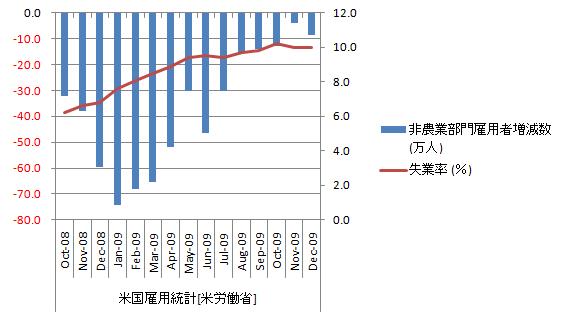 まあ、順調に改善しているようである。先月の非農業部門雇用者数増減数の大幅改善からは見劣りするが思うほどは悪くない。失業率の悪化も止まったようである。失業率が止まっているのは、失業の長期化で「職探しを諦めた人」の増加したのが主因と見られる。雇用環境が改善すれば「職探しを諦めた人」が職探しを始める為、失業率が急低下することはあり得ないが、更なる悪化は考えられない。雇用環境が厳しくなれば「職探しを諦めた人」が増えるだけで失業率が上がることはない。 UPDATE2: 12月米非農業部門雇用者数は予想外に減少、回復期待に冷や水(2009年 11月 6日 22:38 JST ロイター) 失業率と非農業部門雇用者数増減数をグラフ化すると下図のようになる。 非農業部門雇用者数増減数は改善基調、直近悪化。失業率は横ばいで直近も下降。非農業部門雇用者数増減数の改善幅が悪化したのは先月の反動。失業率は緩やかな低下基調に転換したようである。更なる悪化は見込み難い。 新規失業保険申請件数の推移をグラフ化すると下図の様になる。 新規失業保険申請件数の推移から、離職者数の縮小が加速し始めている。今年の3月末には例年水準まで回復しそうだと考えている。 雇用統計詳細からは、製造業からサービス業へ労働力が移動している様子が窺われる。個別の職種を見ると正規雇用(高所得無期)から非正規雇用(低所得有期)へと労働力が移動していると思われる。賃金は改善基調であることは間違いないのだが伸びは抑制的。労働時間も伸びな悩みで雇用拡大の兆しは見えない。米国は『雇用なき景気回復』を続けている。景気回復の足取りは重そうである。参照資料 CPSプレスニュース[米労働省]米国経済(雇用) ブックマーク 経済と株式経済ニュース株取引