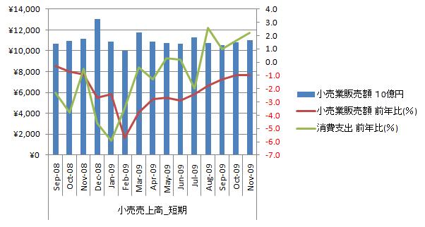 対前年同月比は引き続き改善傾向。消費支出も2.2%で順調に回復している様に見えるが、消費支出は物価下落の影響が大きく名目は0。0%。消費は統計が示す程、改善している感じがしない。実収入が2.5%減と低下が続いていることを考えると先行きは相当に厳しい。 11月小売業販売額は‐1.0%、自動車・家電は好調持続(2009年 12月 28日 10:55 JST ロイタ) 小売業販売額をグラフ化すると下図のようになる。 販売額は横ばいで推移し、直近2か月増加。12月は季節要因で増加が確実だが昨年水準を超えられるかが問題。対前年同月比は上昇基調、直近は横ばい。そろそろ限界に近いのかもしれない。 エコポイントやエコカー補助の政策効果が大きく、実施していなかったらと思うと空恐ろしい。但し、これらの対策で叩き出した需要は買替需要の先食いでしかなく、新規需要を掘起こした訳ではない。必ず、息切れする。夏までには息切れするのではと個人的に考えている。 今の小売業販売額の水準を見るために長期推移をグラフ化すると下図のようになる。 小売業販売額は1990年にピークを形成し、現在に至るまで減少基調。いざなぎ景気を超える長期景気拡大時でも減少基調を転換させることはできていない。減少基調がはっきりした1997年から現在までの一次回帰直線をとるとy=-6.0159x+11858となり、月当たり60億円減、年間で720億円減。12カ月移動平均線は当該一次回帰直線を上から下え突き抜けたところである。12カ月移動平均はもう少し減少が続くことになるだろうが小売業販売額は上昇に転じている。 景気拡大時でも小売業販売額の長期減少基調を転換できなかったことから考えて、日本経済を外需で刺激して、内需拡大で立て直せる可能性は低い。個人・企業どちらに余剰資金が溜まろうとも金融機関の口座を介して政府債務に吸収されてしまい消費や拡大再生産に使うことができない。内需拡大は公的部門の債務があるかぎり不可能と考えている。 参照資料 速報|商業動態統計調査|経済産業省国内経済(消費) ブックマーク 経済と株式経済ニュース株取引