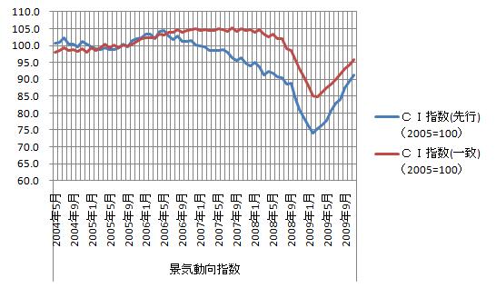 国内景気は11月も拡大局面、「雇用なき景気回復」が続いているようである。中国からの外需で製造業の大企業が景気を牽引している様である。外需に頼れない中小企業は相変わらず厳しく、円高の影響もあり景気動向CI指数の水準はリーマンショック前には遠く及ばない。変動周期から考えて今年2-3月辺りでピークを成りそうだと見ている。 11月の景気一致指数、8カ月連続上昇 外需主導で生産回復(2010年1月9日/日本経済新聞 朝刊) 景気動向指数をグラフ化すると下図のようになる。 CI先行指数・CI一致指数共に上昇基調で、直近8か月連続上昇。昨年の11月中旬頃は円高で景気拡大が年を越えられるか心配したが1月も景気は拡大基調を継続している模様。12月一旦小康を取り戻した円相場が1月に入りまた円高に振れ始め、景気の足をまたぞろ引っ張る気配が出てきている。管財務相の発言で振れ幅が増幅されどの位まで円高に振れるかわからない。 先行きを見通すためDI指数の推移をグラフ化すると下図のようになる。 DI一致指数は100で上限に張り付いているが、DI先行指数が下がり始められている。DI一致指数が下降し始めるのも時間の問題と見られる。景気縮小を体感するようになるのは今年2-3月辺りからと思うのだがどうだろう。 現在の景気拡大は、景気対策の効果で自立回復力がない。政権で止めた公共事業の影響が1-3月に本格化すると見られ景気拡大基調が終了するのは避けられないと見ている。参照資料 景気動向指数(平成21年11月分速報)[内閣府]国内経済(景況感) ブックマーク 経済と株式経済ニュース株取引