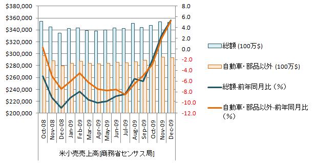 まさかの減少。値引きと販売時間延長でも天候不順の影響を埋め合わせることができなかった様である。前年同月比5.4%増で前年のクリスマス商戦よりは酷くない。小売売上高は増加基調を維持している。しかし、自立的な拡大には至っていない様である。生活必需品は増加基調、低価格商品選好で売上拡大中。人口増加の影響。耐久消費財は減少基調。値引販売でも売上は増加しない。個人信用収縮の影響。生活必需品を除く非耐久消費財は緩慢な増加基調、ほぼ横ばい。消費者の倹約疲れの影響。人口ボーナスがなければ日本とさほど変わらない。 。 UPDATE1: 12月米小売売上高は予想外の減少、自動車などへの支出減る(2010年 01月 15日 00:37 JST ロイター) 米小売売上高をグラフ化すると下図のようになる。 総額は増加基調を維持し、直近は減少。対前年同月比はプラスに転換し上昇基調。直近5ヵ月上昇。増加基調ではあるがV字回復には程遠い。 自動車・同部品を除いた額も増加基調を維持し、直近5ヵ月増加。対前年同月比はプラスに転換し上昇基調。こちらも増加基調ではあるがテンポは相当に鈍い。 現在の水準を見るために長期推移をグラフ化すると下図の様になる。 現在水準は2006年と同程度。2005年1月から2007年12月までの総額の回帰直線はy=1224.3x+333142、自動車・同部品を除いた販売額はy=1153.9x+259647。 2008年12月から2009年12月の回帰直線は総額でy=1237.4x+335368、自動車・同部品を除いた額はy=908.68x+279927。 総額は傾きが、1.1%増、自動車・同部品を除いた額で21.3%減。夏に終了した自動車買い替え支援策の影響。今後、政策支援が徐々に期限切れを迎え、消費はL字型の軌道をたどる可能性が高い。 米国経済は内需主導の景気回復パターンが非常に多く、生活必需品を除く非耐久消費財及び耐久消費材の売上額増加が雇用増加に先行する。しかし、現状は、耐久消費材が増加基調に転じない。雇用増加が起きるには今夏以降になると予想される。この間に過剰流動性の巻き戻しや中国経済のクラッシュが起きるとかなり厳しいことになる。中国は何時までも現状を維持できるとは思えず、個人的には今年いっぱい位だろうと考えている。調整は避けられないと考えている。参照資料 米小売売上高統計[商務省]米国経済(消費) ブックマーク 経済と株式経済ニュース株取引