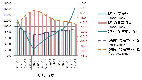悪くはないが良いとも言えない。経済産業省による製造工業生産予測調査の先月予測値3.4%増には遠く及ばないし、市場予測の平均2.5%増にも届かない。生産指数は増加基調は継続しているが拡大速度は低下しており2009年3月までにはマイナス圏に沈むと個人的には見ている。経済産業省による製造工業生産予測調査は2010年1月を1.3増、2月0.3%増。1月は、一般機械工業、輸送機械工業、金属製品工業等の強気生産計画の影響、2月は、一般機械工業、鉄鋼業、電子部品・デバイス工業等の強気生産計画の影響と発表されている。 全体的には中国頼みの外需依存で生産が拡大したいる様に見える。中国金融当局が金融引締め姿勢に転じていることから1月は相当に厳しそうだと考えている。製品在庫率の水準はまだかなり高く、決算対策で製品在庫を来年度に繰越せそうにない。個人的には受注を取り溢すリスクよりデフレ継続下での在庫増の方が怖い。12月の鉱工業生産2.2%上昇 10カ月連続(2009年 1月 29日 日経ネット) 鉱工業生産・在庫指数をグラフ化すると下図のようになる。 生産指数は上昇基調、直近10ヵ月連続上昇。対前年同月比も同様。在庫率指数は下降基調、直近2ヵ月連続下降。在庫率指数は大幅に改善し、3月までには適正水準の100に到達できそう。出荷見合いではあるが決算期に向け生産を増加させる状況にない。、 前月比の推移をグラフ化すると下図の様になる。 生産指数の前月比は、下降基調、直近は横ばい。下降基調ではあるが1月はプラスを維持できそう。しかし、3月までプラス圏を維持できるかは微妙。出荷も同様で生産よりも先行きが悪い。在庫指数の前月比は0近傍を横ばい、直近も横ばい。在庫の減少は止まっている。思いのほか出荷が伸びず生産増で、在庫指数が下降しない。 対前年同月比の推移をグラフ化すると下図の様になる。 生産・出荷指数の対前年同月比はプラス圏にに転換。これは前年の異常な落ち込みの影響。在庫指数の前年比同月比も大分改善して来ている。 現状の在庫率指数を見る限り、在庫は過剰。デフレが継続する中、在庫を持つことは経営的にはマイナス。年度末に向け生産調整が見込まれる。 また、米国は雇用対策で保護貿易色を今後も強めてくると予想され、国内からの輸出は元より中国から輸出も阻害される可能性が高い。 昨年来、加熱が心配された中国経済も金融引締めで今後の輸出の伸びは期待できない。 今後の外需の伸びは限定的、内需は決算要因で生産拡大は止まると見ている。個人的には2月に鉱工業生産がピークを付け、6月あたりまで減少しそうな気がしてならない。参照資料 鉱工業指数[経済産業省]国内経済(鉱工業) ブックマーク 経済と株式経済ニュース株取引