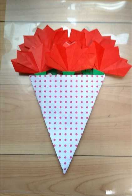 先月母の日があったので、子供達が使っていた折り紙がかなり残っていたので試しにカーネーションの花束を作ってみました