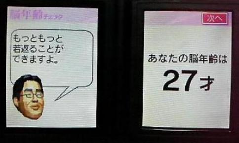 「脳トレ」だども、一昨日、ついに20代に突入!だども、これは苦手な単語記憶がなかったからで、今日やったら、実年齢の38才に戻りました(^^;)計算問題も、答えが出なくなる時があったりして、ちょっと余裕がないかもしれません。毎日の地道な訓練が大事だすな(^^)/