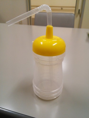 失調の患者さんに対して、ストロー付きボトルで、とろみ茶を飲んでもらったケースがあったので、報告します。◆脳幹梗塞◆四肢・体幹に失調あり。起立は物的支持で見守り~軽介助◆嚥下障害あり。水分は濃いめのトロミ。食事は移行食(全粥、キザミ+トロミのあん)◆食事動作は、右手スプーンで、前半自己摂取も、後半は失調による食事動作の疲労でむせが増えるため介助◆発話明瞭度3レベル(痰が多く湿性嗄声で聴取しにくい)とろみ茶は、コップでは口唇からこぼれる。口唇閉鎖不全のためストローでは吸えない。よって、スープカップからスプーンで自己摂取してもらっていました。しかし、時折、スプーンで取り込む前にこぼれてしまったり、失調のため過剰に力が働くことがあり、動作での疲労もあります。そこで、以下のようなボトル+ストローを製作し、持ち手(右手)で握って出てくるようにしました。失調のため握力の調整は難しいですが、ボトルに適度な反発力があり、うまくいきました。取り込みも、スプーンに比べてストローの方が、口腔内へ入りやすく、摂取における疲労も少し減少したようです。【作り方】◆「ダイソー」のドレッシングなどをいれるボトルを使用◆ボトルの注ぎ口が細く、ストローは入らないため、ボトルの上部を1~1.5cmほど、ニッパで少しずつ切る。◆切りすぎると、ストローとの間が開いてしまい、空気がもれ、ボトルを押しても出てこない。◆ストローとの間に隙間がないようにする必要があります。◆ストローとのサイズを見ながら、少しずつニッパで切っていきます。ストローを合わせるときは、注ぎ口の下から入れます。◆下からストローを入れると、少しきつめでも入れることができて、隙間の調整がしやすいです。◆下からストローを入れるときは、ストローのジャバラ部分は伸ばして入れます。◆切り口はヤスリで削る。◆材料がそろっていれば、製作時間は、40~60分程度。ただ、ここに至るまでは、いろんなボトルを試したり、いろんなストローの長さや径のものを調達したりと、試行錯誤しました。同じ6mm径のストローでも、商品によって、微妙に径が違いました。上記の通り、微妙な径の違いで、空気が漏れたりするので、実際に使用していくストローで調整しました。このボトルで、濃いめのトロミ茶、カロリーメイトゼリーを摂取してもらっていました。