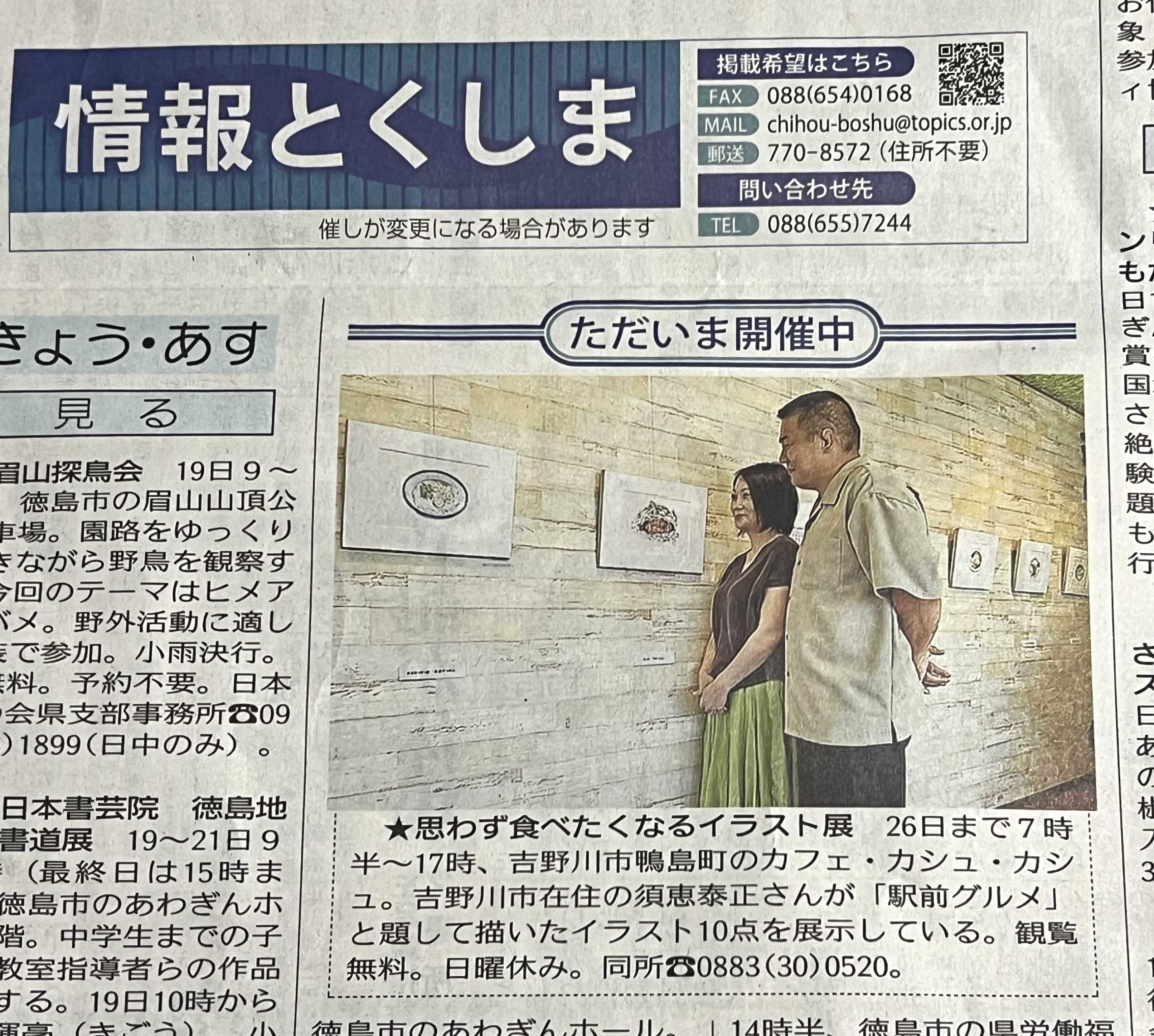 朝は少しましなのですが・・・住んでいる吉野川市山川町の西隣り、美馬市穴吹町の観測所では37時超え‼︎いかにも暑くなりそうな空です。吉野川市山川町のカフェレスト「シェフ」で昼食です。「日替りランチ」は「コロッケ」と「鶏肉と野菜のカレー炒め」でした。今朝の徳島新聞に14日から始まっている「すえドンの思わず食べたくなるイラスト展」が紹介されました。駅舎の鉛筆画と「駅前グルメ」とありますが、展示は「駅前グルメ」10点だけです。