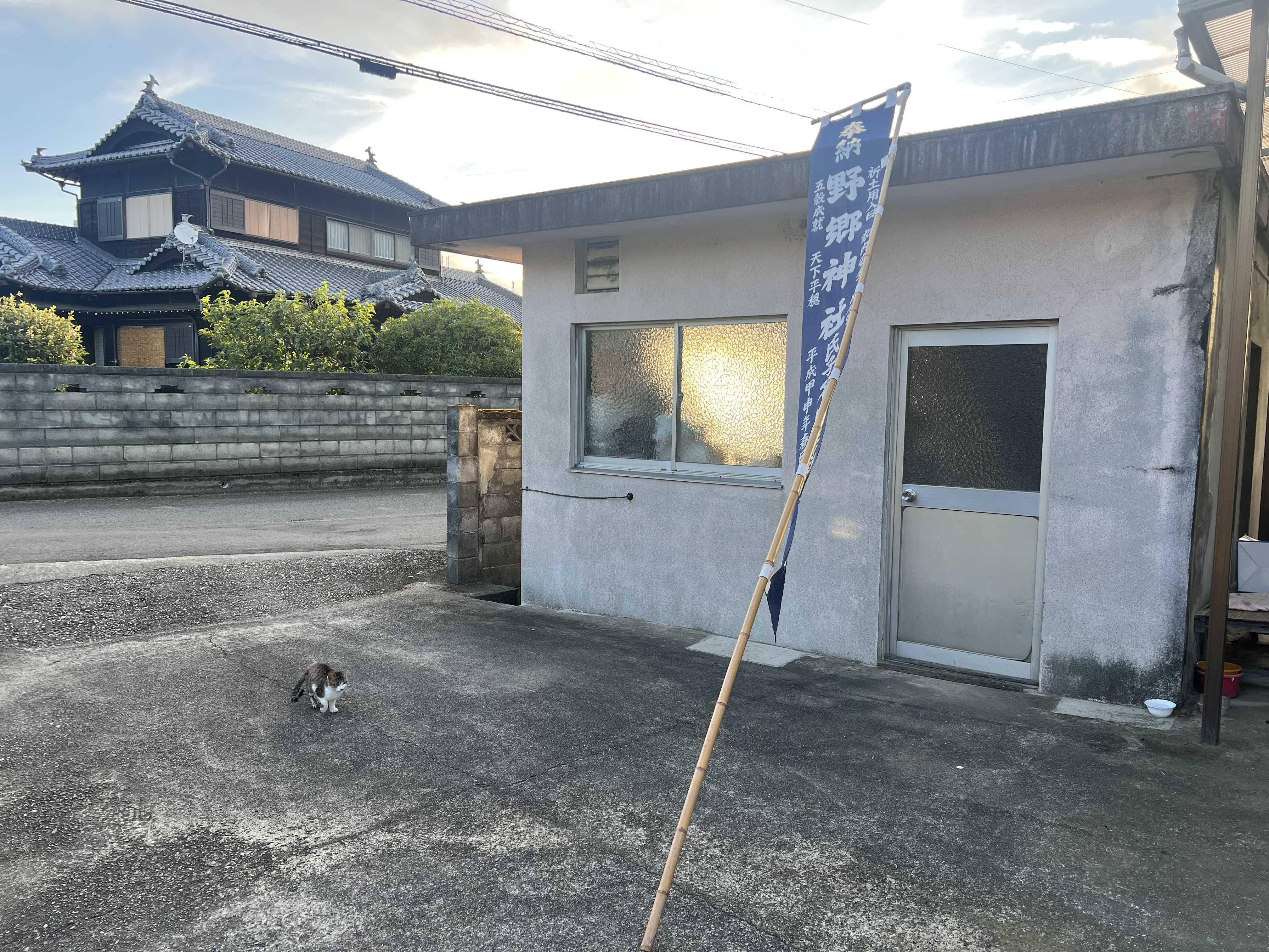 午前6時、幟を持って徒歩3分の「野郷神社」へ。大きな椋の木があるところに「野郷神社」はあります。「野郷神社」は小さな祠です。山川町史には記載はありたせん。古老に聞くと「牛馬の神様」らしいです。数日前は草も生えていなかったのですが、先日の雨で一気に成長していました\(//∇//)\草抜きをして、周辺は草刈機を持って来て仕上げました。「野郷神社」と「幟」♪お供えをしました。
