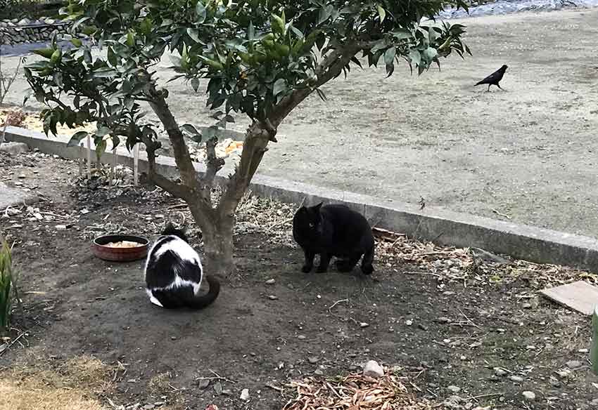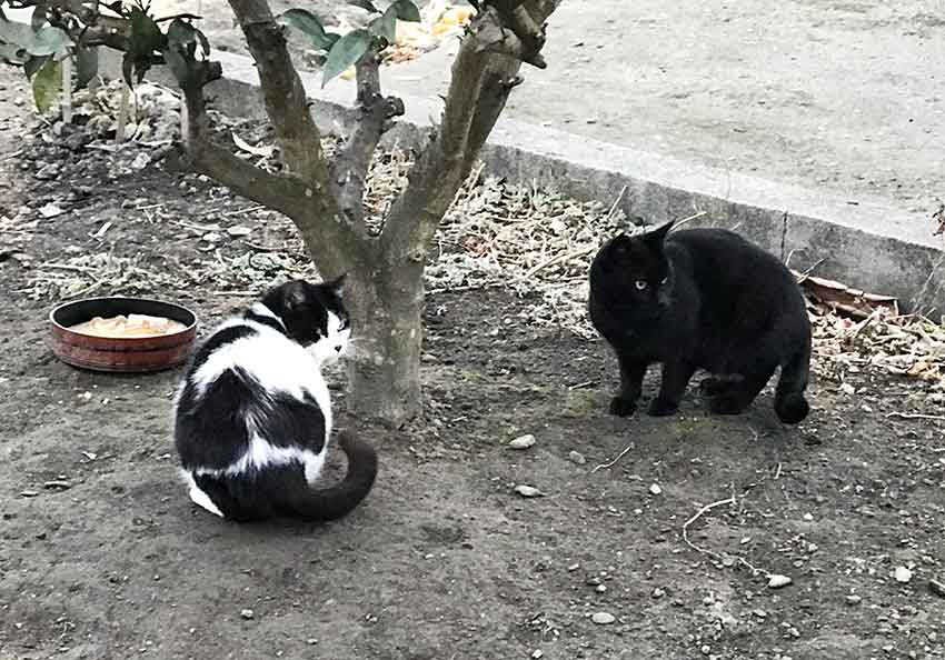 エサを食べるあずきと、食べたいけど遠慮しているクロです♪