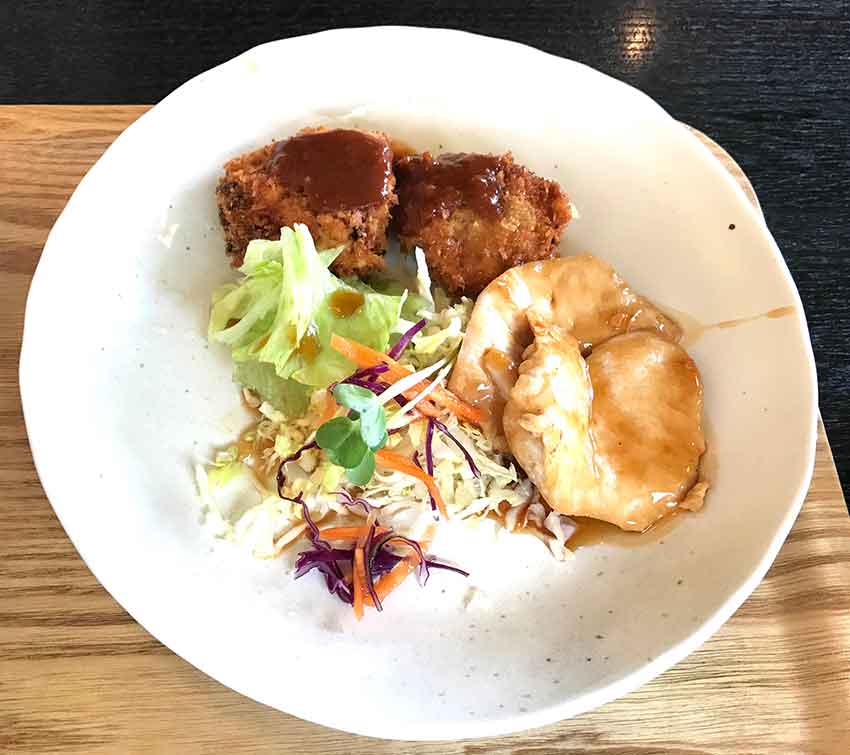 ​「日替わりランチ」は「レンコンと挽肉の挟み揚げ」と「照り焼きチキン」でした!!​