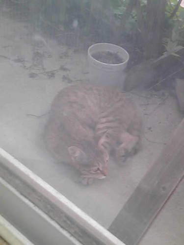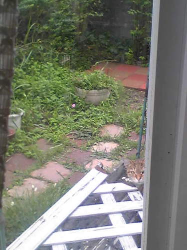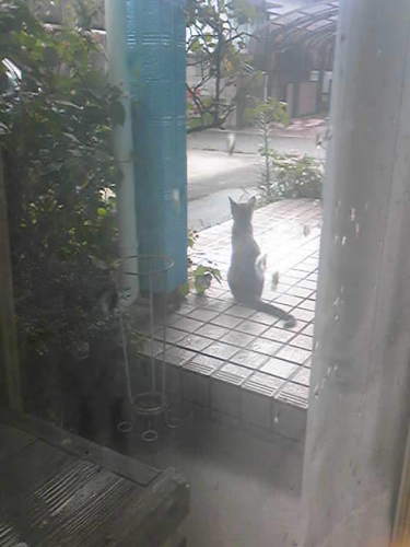 近づきつつある台風の影響で風が強くなり始め・・・こんなときに、なぜかいつも来る猫がいます。「いつも」と言ったって、たまたまだよなぁ、と、出窓のカーテンを閉めるついでに覗いたら・・・いた。(笑)いたよ~(わかるかな?)エアコンの室外機の上に・・・(←いつもの場所)カバーの前格子がはずれたのが、ちょっとじゃまですネ。(家人め、いつのまにか余計なことを)よかったら、お家に入るかい~?(念)しかし、家人が無理に近づいたので、去ってしまいました。(家人め、またも余計なことを!)うまく風雨をしのげる場所でやり過ごせればいいのですが。
