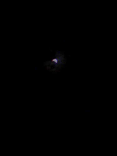 月が欠けていくのを 表に出て見ていた。(肉眼では、地球の影に入った部分が赤黒く見えました)その間に、焦がしたピザそして勢い余ってかけ過ぎたタバスコ(・・・赤黒い・・・)・・・で、悶絶しまくった皆既月食の夜。