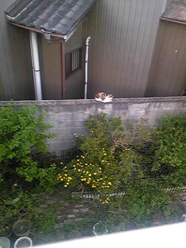 ブロック塀の上にちんまりと三毛猫。ノスタルジーに浸りつつ見入っていたのですが当の猫は見られているのに気づいてちょっと警戒気味・・・