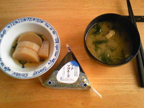 渡りに舟とはこのことか。当てにしていた冷凍の玄米おむすびが切れてたので今から炊くか、いや時間が・・・どうしようかな~と思案していたところにコンビニおにぎり(ツナマヨ)が転がり込んできました。家人がボランティア活動のお昼としてもらってきたもの。(現地で食べて済ませてくればいいものを)ま、どう転んでも結局は粗食ですなぁ