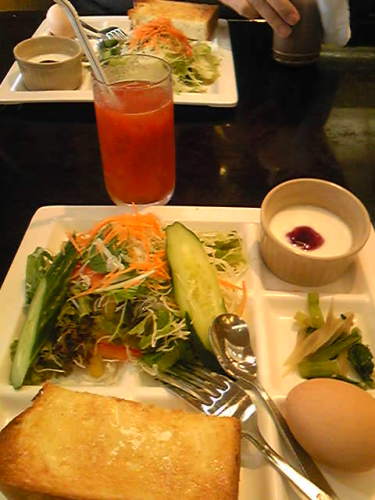 朝食は喫茶店のモーニング・サービス。朝食作りのモチベーションを上げるのにふさわしい・・・昨日、家人が職業訓練の試験を受けたときの話。筆記試験で四文字熟語が一つ、どうしてもわからなかったと。「一望□里」・・・□の中に入る漢字を答えよと。答えは「一望『千』里」。(広大な眺めを一目で見渡せること)それは、まだいい。2000円の商品が3割引です。さて、いくら支払えばいいでしょう?家人の答え:1200円・・・なんでやねん!「200円はがんばって値切る・・・」・・・なんでやねん!!!あわよくば、開講期の11月から三ヶ月はまた私の自由時間が持てると楽しみにしていたのにこれでは合格が・・・どうなるのか!?スーツでビシッと決めていったのにねぇ・・・(久しぶりなので写真撮影)