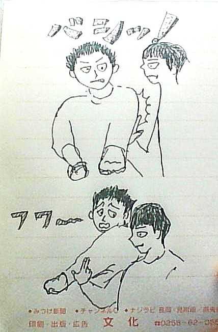 続いて欄雀尾。相手は右上段突き。こちらは相手の踏み込みと同時に左足を左斜め前に進める。この際、右足に一瞬でも重心を移してはならない。相手の踏み込みと同時に足を進めるので、右足のバネをためてから左足を進めたのでは間に合わない。まして右足に重心が乗った時点で相手はこちらの動きを予測して軌道修正する。ただ直立したまま体を前に進め、左足だけが左斜め前に進む。相手の突きが怖いからと首を傾けたり、上体を捻ってはならない。その動きをとらえてどこまでも相手の拳は追ってくる。相手の突きをまともに顔面にくらう覚悟で進む。これにより数センチの見切りで相手の突きをかわすことができる。そのあと余裕を持って右螺旋掌で相手の右肘外側をまくり上げる。これによりあいては後方にのけぞる。もうすでに「術」にはまっているのだ。続いて相手は態勢を立て直して左上段突き。こちらは相手が態勢を立て直すのを待ってあげる。相手の左上段突きに対して右足を半歩横に移動させる。この時も左足にバネをためてからでは遅い。全身の動きを静止させ右足だけを移動させる。これによりこちらの顔は相手の拳から数センチ移動する。すなわちギリギリで見切る。これで相手の皮膚感覚が作動し、体全体力がぬける。すかさず、右前腕で相手の左前腕を手前に上から下に半円を描いて巻き落とす。同時に右足を振り上げるようにして前方に進める。右足が振り上げられて、床に着地するまでの間に右前腕で相手の左前腕を巻き落とすと、車で急ブレーキをかけた時のように前のめりに崩れる。この右腕の操作が右足の着地の前に終わっていれば、相手は大きく前のめりに崩れるが、着地と同時に右手の操作をしたのでは、間に合わない。相手はほとんど崩れない。しかし、着地の前に完了すれば、相手は大きくつんのめることになる。必然的に転ぶのを防ぐために左足が前になる。その左足の後ろに右足を進める。相手は左足前で右足後ろになっている。その左足踵のうしろから左前方約70度の角度で相手のまた下に踏み込む。それと同時に右前腕を左わき腹に水平に当て、左掌を右前腕遠位に当てる。右足が着地し、そこに左足が短く鋭く引き寄せられる時、左掌底から勁を発する。艮(手偏がつくけど)歩だ。もちろん本当にわき腹に打てば息が止まってしまうが、それではあぶないので相手の左肘を脇腹までおろさせてガードさせ、その腕の上から勁っを発する。それでも何回かやると気持ち悪くなるので、動作を大きく緩やかにしてふっとばす。左斜め前方70度。この角度で押されると人はもろくも抵抗できず吹っ飛んでしまう。次は相手が右上段突き。同じ要領で右肘外側をめくりあげる。あいては態勢をたてなおして左上段突き。これも同様に右足を右に進めて数センチで見切る。このときこちらの顔は相手の正面に向けたまま動かない。相手の左拳はこちらの顔の横を通り過ぎて、私の顔の位置の後方に延びていく。それに合わせて左手で相手の左拳面に接触させながら、相手の肘が思い切り伸び切るように導く。こちらの左手が相手の左拳に圧力を与えなければ、何の抵抗感もなく肘が伸びきってしまう。それどころか、こちらの手のひらに吸い込まれるように前にめりに崩れる。その伸びきった腕を自分の首に巻き付けるように180度回転しながら、相手の伸びきった肘を右肩に担ぐ。これで関節技がきまる。さらに左手の指3本で相手の拳を押し、左手首を背屈させると、さらに深く肘関節がきまり、釣り上げられた魚のようになる。また文章が長くなったので、稽古日誌(3)に続く。