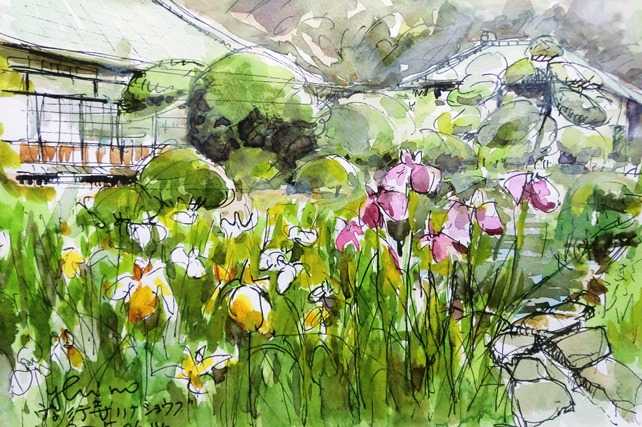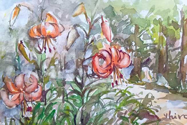 スケッチは夏の花、クルマユリ。「夏山の草原を明るく飾るクルマユリの花は、高山植物の女王的存在です」本来の出身は涼しい高山地帯のようです?が今は身近な市街地でも見かけることが多くなりました。濃いオレンジと可愛いマルマルの容は遠眼からでも目立ちます。藤沢市・引治川沿いの植え込みで出会いました。強い陽射しの中でしたが、山地の仲間と同じように生き生き輝いていました。