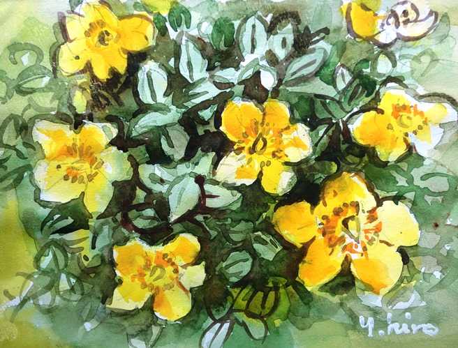 庭の花キンシバイを描きました。雨に濡れると濃い黄色の花、緑の葉が一層映えて見えます。以下はネットで得た情報よく茂った濃い緑色の葉に映えるキンシバイの黄金色の花は、初夏から夏へと移り変わる季節を知らせてくれます。枝垂れた枝の先端にうつむき加減に花を咲かせる、江戸時代に渡来した中国原産の半常緑低木で、古くから観賞用として栽培されてきました。キンシバイの仲間(オトギリソウ属)の日本原産種には、薬草として知られるオトギリソウ(Hypericum erectum)やトモエソウ(H.ascyron)など20種ほどがありますが、いずれも草本植物です。