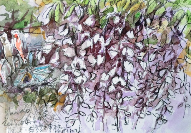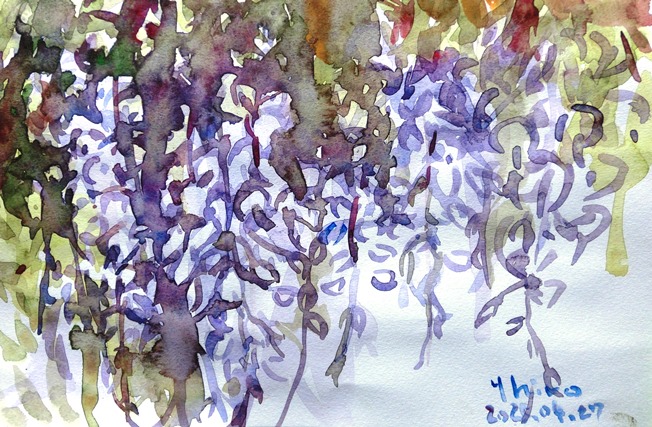 ここは藤沢・引地川沿い。フジの花が咲きだしました。今週は5月突入ですね。葉の出方が例年より早めの気がしますが・・・これから増々花房が大きくなって5月の連休中には見ごろでしょう。トランプ嵐が連日吹き荒れていますが、穏やかな連休になりますように。透明水彩、直描き