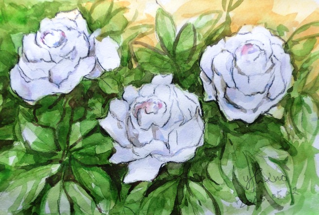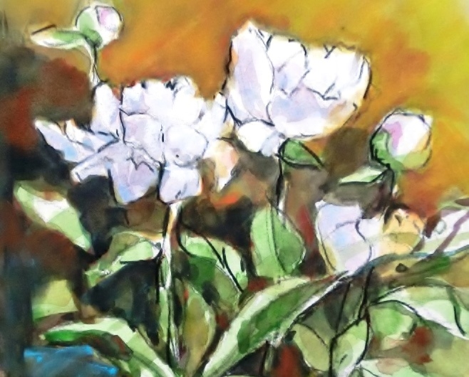 シャクヤク、お日様を浴びると、花はたちまち大きくひろがって豪華な感じに変身。白の塊を描くのは一層困難に・・・苦戦、苦戦・・・でも勉強になりました。