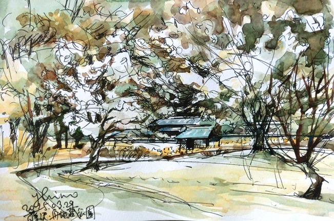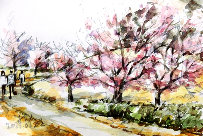 昨日の4月陽気が一変して、今日は寒波再来?昼過ぎから都心でも雪がちらつくとか??この時期の雪には春が本当にやって来た感じです。スケッチは開花を待ちかねた早咲き河津桜。ここは藤沢市・引地川親水公園。まだ幼木ですが、遠くから見てもにもピンクが目立つようになりました。散歩の人も遊ぶ人も。皆時季外れの陽気に踊っていました。