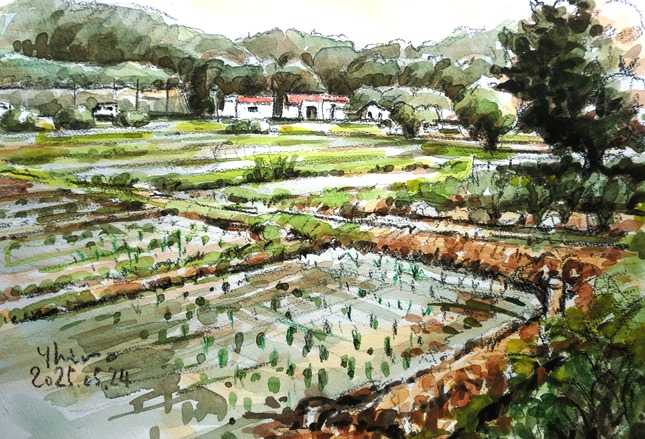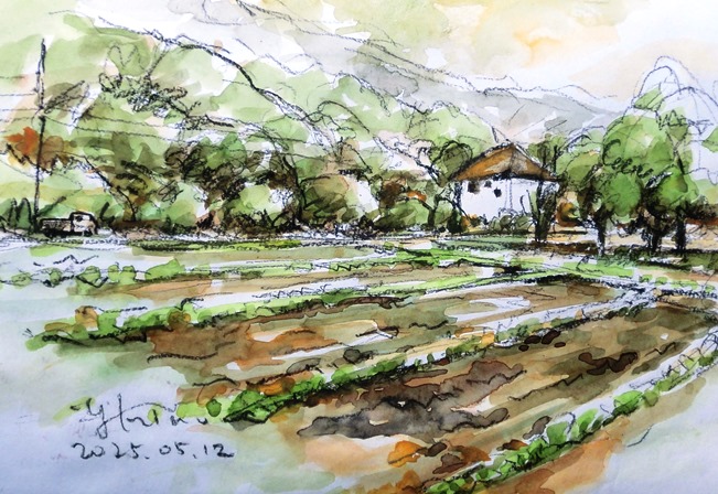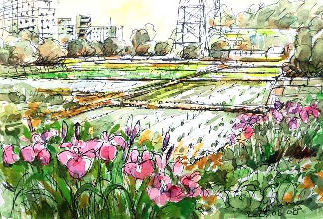 スケッチは藤沢市・引地川沿いの田んぼ。ここのところ田植えが急ピッチで進んでいます。機械化で小さな田んぼの田植えもあっという間。庶民の目先の問題は今、米価高騰!思い切った大胆な対策を期待し、今年の豊作も合わせて祈りましょう。