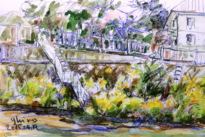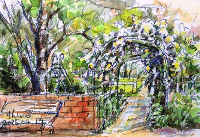 ここは藤沢市・引地川沿い。川沿い遊歩道を歩くうちアーチのツルバラに出会った。休息をかねてしばしスケッチ。ダーマトグラフ、透明水彩