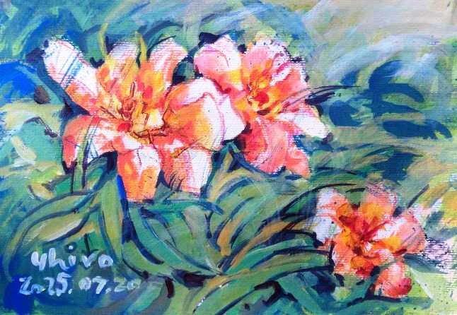 今日の花はヤブカンゾウ。場所は藤沢市・引地川親水公園近く。川沿いから少し離れた田んぼ沿いの道わき。文字通り道脇の藪の中で強いオレンジの色が目につきました。アクリル、パステルほか使用以下はネットで得た情報花が咲くまでの姿がほとんど同じヤブカンゾウとノカンゾウですが、ヤブカンゾウは八重咲き、ノカンゾウは一重咲きなので、花を見ると誰にでもひと目で見分けられます。以前はユリ科として分類されていましたが、最近のDNA解析による植物分類によると、ユリ科からワスレグサ科に変更された植物です。