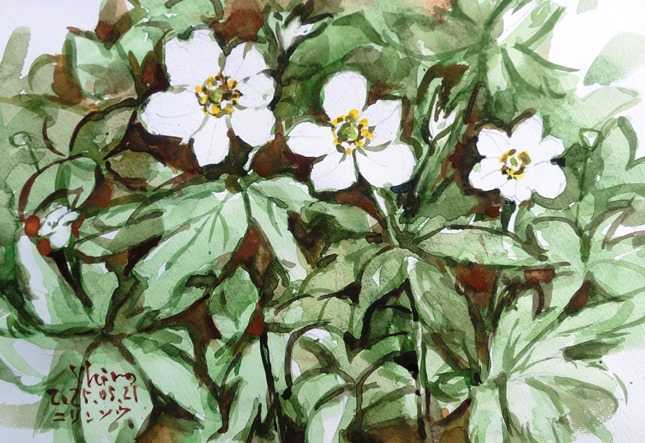 庭に咲くニリンソウを描きました。ニリンとありますが、一輪ずつ開花がずっれて咲くので実際には一本の株で一輪を目にすることが多いようです。ではイチリンソウとニリンソウの違いは・・・?見分け方は花の大きさ(イチリンソウの方が倍以上大きい)と花の軸(ニリンは集まった葉の中央から伸びている)だそうです。
