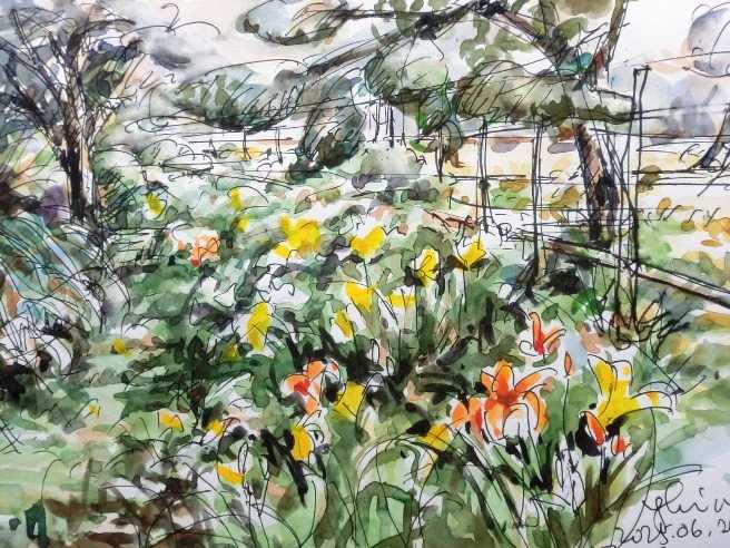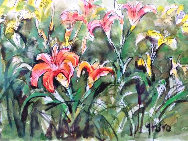 7月初め(7/3)にユウスゲを当ブログに載せました。スケッチはノカンゾウ、同じ藤沢市・親水公園です。黄色のユウスゲは姿を消し、今はノカンゾウが一塊、二塊の状況です。暑さに強いのでしょうかね?濃いめの黄色やオレンジの花が皆天を向いていました。