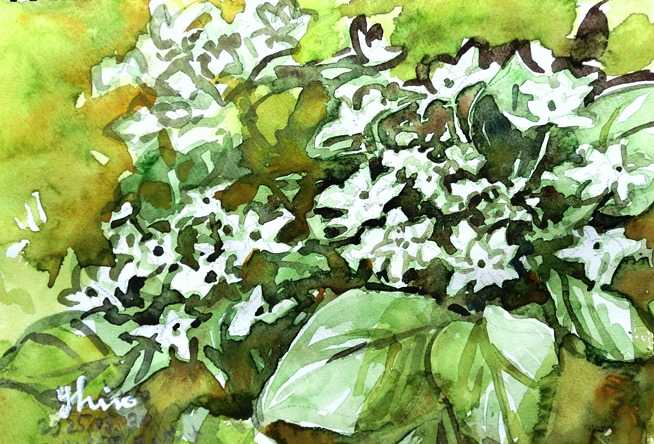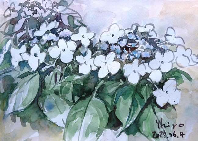 アジサイが賑やかになってきました。公園、道沿い、人家の庭、田んぼの畔沿い・・・地域活動、町興しの一環などでアジサイ祭り開催の声もそちこちに。近隣から頂いたガクアジサイを描きました。