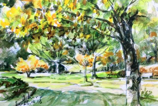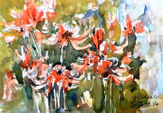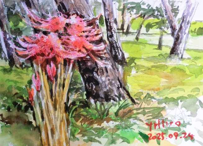 秋のお彼岸に入って、だいぶ過ごしやすくなりました。日中の陽射しは相変わらず強いが、湿度が低く秋を感じます。場所によって多少のずれがあるようだが、彼岸花もそちこち目につくようになりました。スケッチは神奈川県・辻堂海浜公園、クロマツの植え込みの中に咲く彼岸花に目を魅かれました。ダーマトグラフ、透明水彩