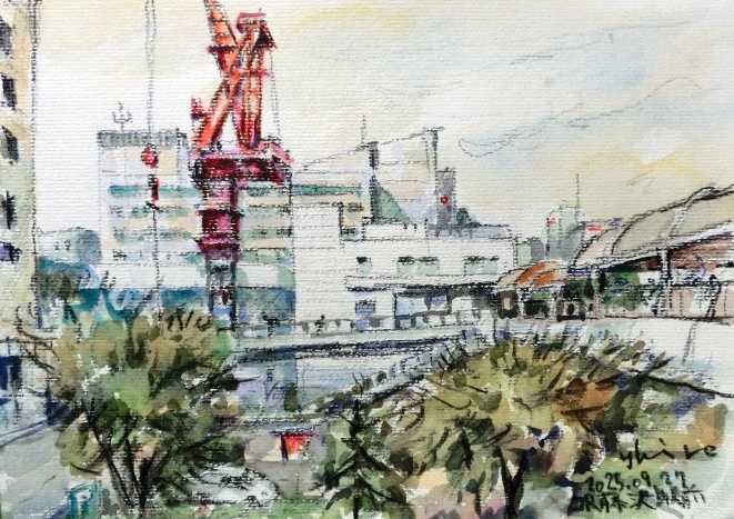 スケッチはJR藤沢駅南口前。ビルや建物が入り混じる中に立つ大きなクレーンが目についた。九月も直終り。暑くて外出は控えていましたが、少し外を眺める余裕が出てきました。少しうるさい感じもしますが、大きなクレーンは活力を感じて好きです。植込みの木々の葉は秋色に変わり始めていました。