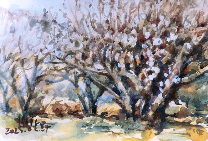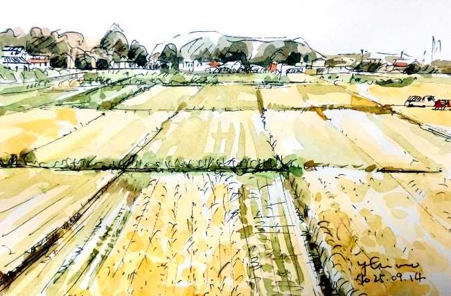 秋晴れに時折走り雲が陽射しをさえぎり、土肌を赤くしたり黒くしたり。見慣れた田畑の光景でも、降り注ぐ陽光の加減で周辺の光景にハッと目を魅かれることがあります。スケッチは散歩の途中、道沿いに広がる畑の風景。畑に広がる陽光の中、一瞬無風、無音、しゃがみ込んで野菜を収穫する人物も静止?当方も足を留めて息をのむ。 無無無・・・