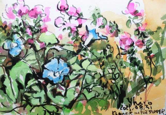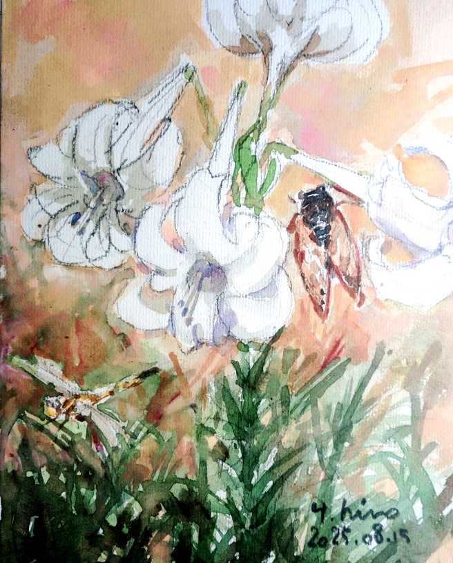 昨日(8/15)朝、雨戸をあけるとまもなくアブラゼミが日よけを潜って網戸にとまりました。次いで、庭に目をやったらトンボが芝生に軟着陸。タカサゴユリのスケッチをしながら蝉もトンボも描き加えました。戦後80年のこの日、のんびりスケッチなど出来る今に感謝し、平和がいつまでも続きますよう願いました。 今、藤沢市・引地川沿いでタカサゴユリが沢山咲いています。上流から流れ着いたものでしょうか?川の内壁沿いの洲に広がっています。