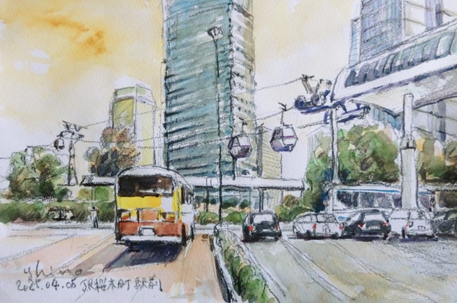 久しぶりに横浜に出かけた。スケッチはJR桜木町駅前。バス停でバスを待つ内、ふと顔を上げたら目の前に見慣れぬ風景??もうだいぶ前から聞いてはいたが、空中にぶら下がったゴンドラにお目にかかるのは初めて。最初はびっくり、バス停の上に動くゴンドラ!しばらく来ぬうちに、ずいぶん変わったものだなぁ~が実感でした。ゴンドラは桜木町駅前と横浜ワールドポーターズ前を結ぶ"日本初"の都市型循環式ロープウェイ「YOKOHAMA AIR CABIN」