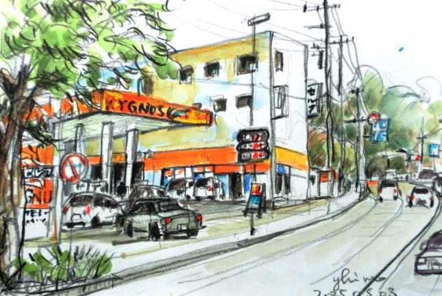 スケッチはガソリンスタンド。免許はもう返納し今は自転車の身だが、通りがかりに目にするガソリンの価格にはつい目が魅かれる。セルフスタンド、リッターあたり177円?客もスタンドも、どちらも大変でしょうが給油する車は次から次へと切れることなく・・・。