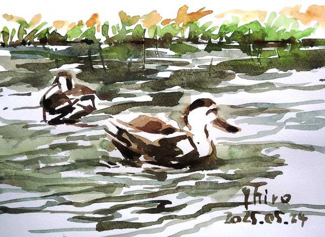 水の入った田んぼではつがいのカモがスイスイ。時折水面に顔を突っ込みながらまたスイスイ。下、スケッチは藤沢市・引地川沿いの田んぼ。(前回5/24掲載)